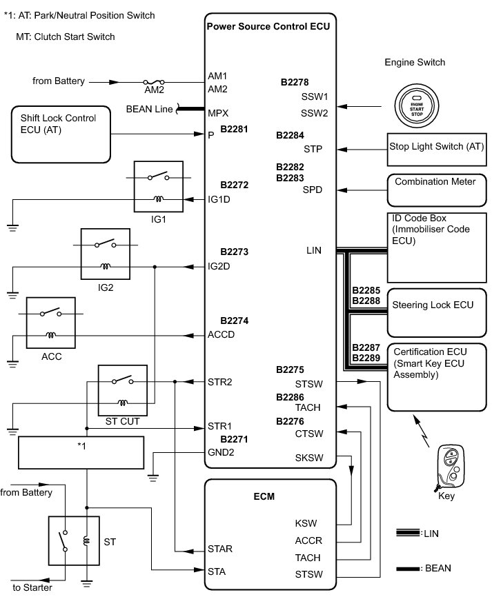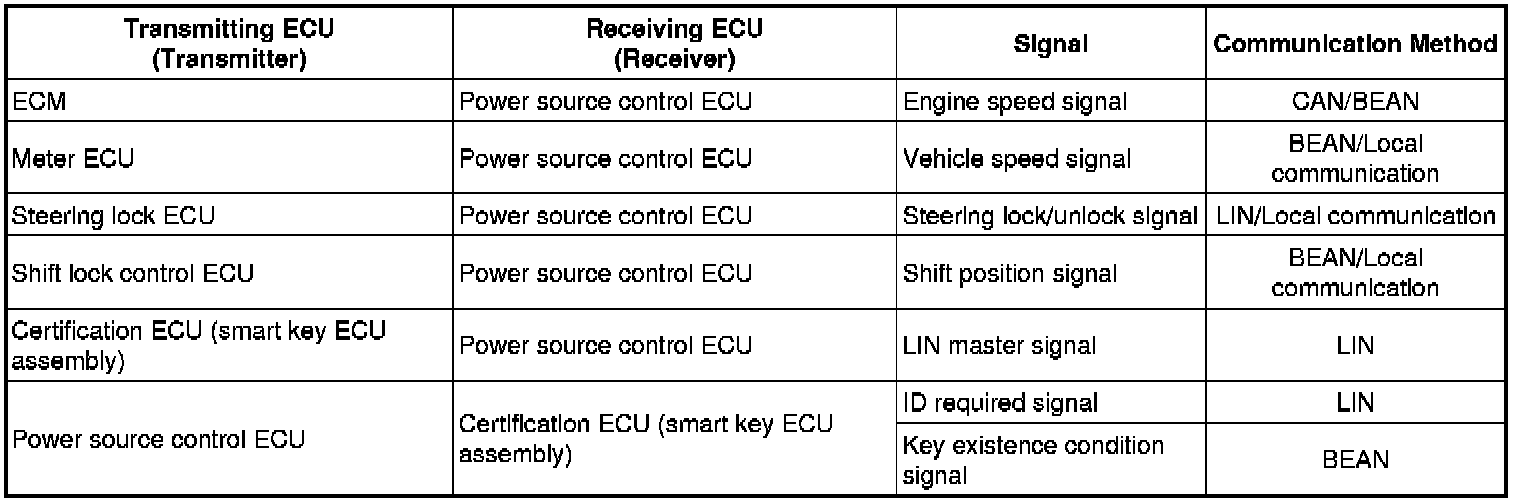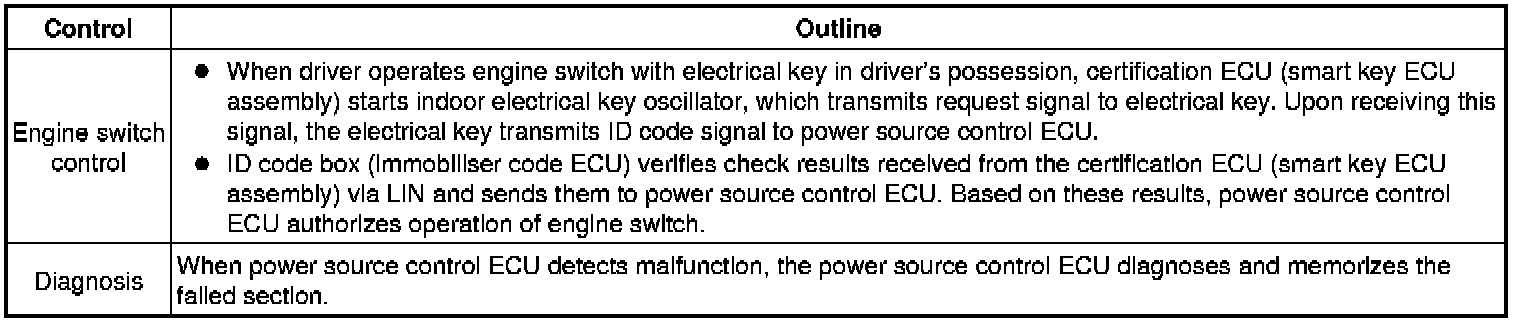 (a) The push-button start uses a push-type engine switch, which the driver can operate by merely carrying the electrical key. This system consists primarily of the power source control ECU, engine switch, ID code box (immobilizer code ECU), steering lock ECU, electrical key, ACC relay, IG1 relay, IG2 relay and certification ECU (smart key ECU assembly). The power source control ECU controls the system. This function operates in cooperation with the smart access system with push-button start.