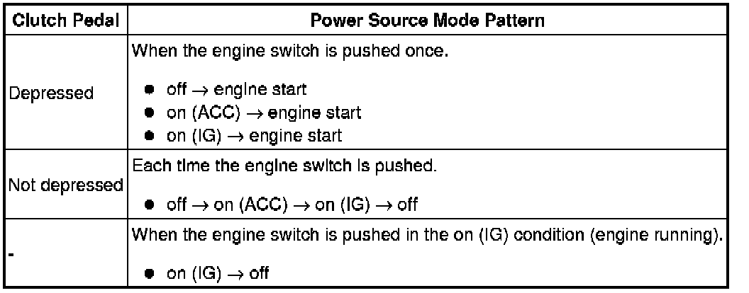 After the buzzer sounds, if the engine switch is pressed within 5 seconds with the clutch pedal not depressed, the power source mode changes to on (ACC) or on (IG), the same as in the normal condition.