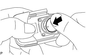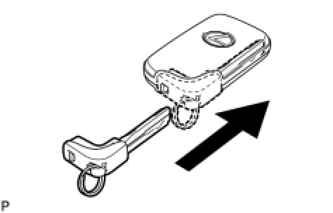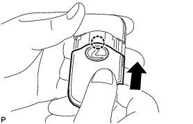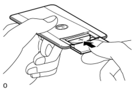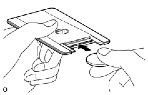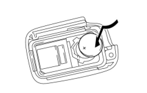 (a) Push in and install the transmitter battery (lithium battery) while being careful of the following: 1) the orientation of the battery positive (+) and negative (-) terminals; and 2) being sure to insert the battery between the 2 terminals and deep into the card in the direction indicated by the arrow in the illustration.