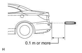 (3) Inspect the key lock-in prevention detection area and the door control receiver for wave leaks. Hold the key at the same height as the lower edge of the luggage compartment door aligning it with the center of the rear of the vehicle. Pay attention to the direction and position of the key shown in the illustration. Check that when the key is over 0.1 m (0.328 ft.) from the rear bumper, the wireless buzzer does not sound. If the warning buzzer sounds, the door control receiver may have a wave leak.