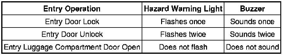 (1) Place the key in the luggage compartment with all doors locked. Check that: 1) closing the luggage compartment door triggers the key wireless buzzer (which lasts approximately 2 seconds), and 2) pressing the luggage door opener switch opens the luggage compartment door.