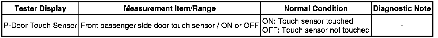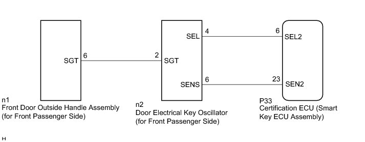 If the front passenger door entry lock function operates normally, but its entry unlock function does not, this means that the request code from the front passenger door is being output normally. In this case, a malfunction in the touch sensor circuit (from the certification ECU (smart key ECU assembly) to the front door outside handle assembly (touch sensor)) is suspected.