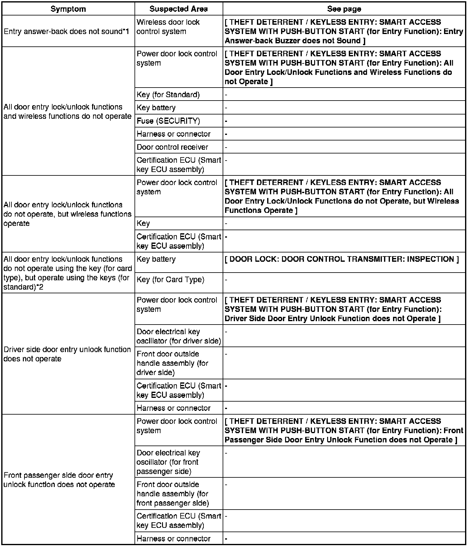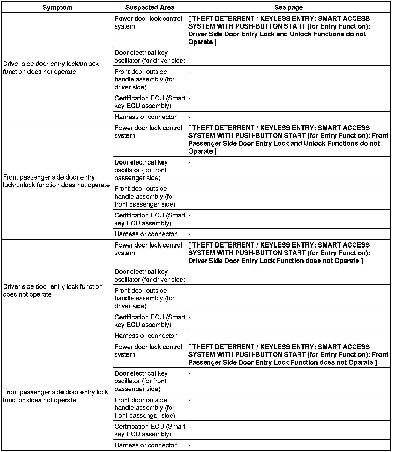 THEFT DETERRENT / KEYLESS ENTRY: SMART ACCESS SYSTEM WITH PUSH-BUTTON START (for Entry Function): PROBLEM SYMPTOMS TABLE