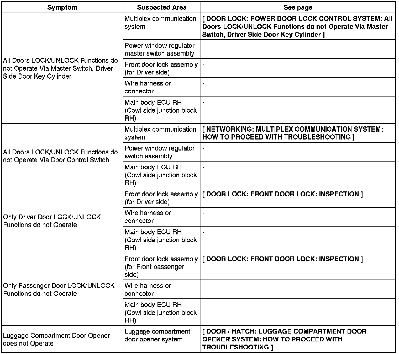 DOOR LOCK: POWER DOOR LOCK CONTROL SYSTEM: PROBLEM SYMPTOMS TABLE