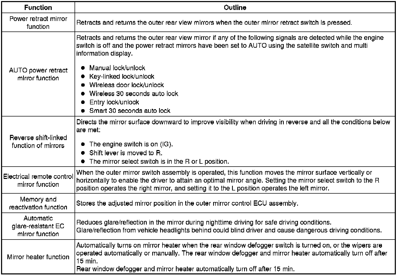 (a) This system has the following functions: automatic glare-resistant electrochromic (EC) mirror function, auto electric retract function, reverse shift-linked function, electrical remote control function, memory function and mirror heater function.