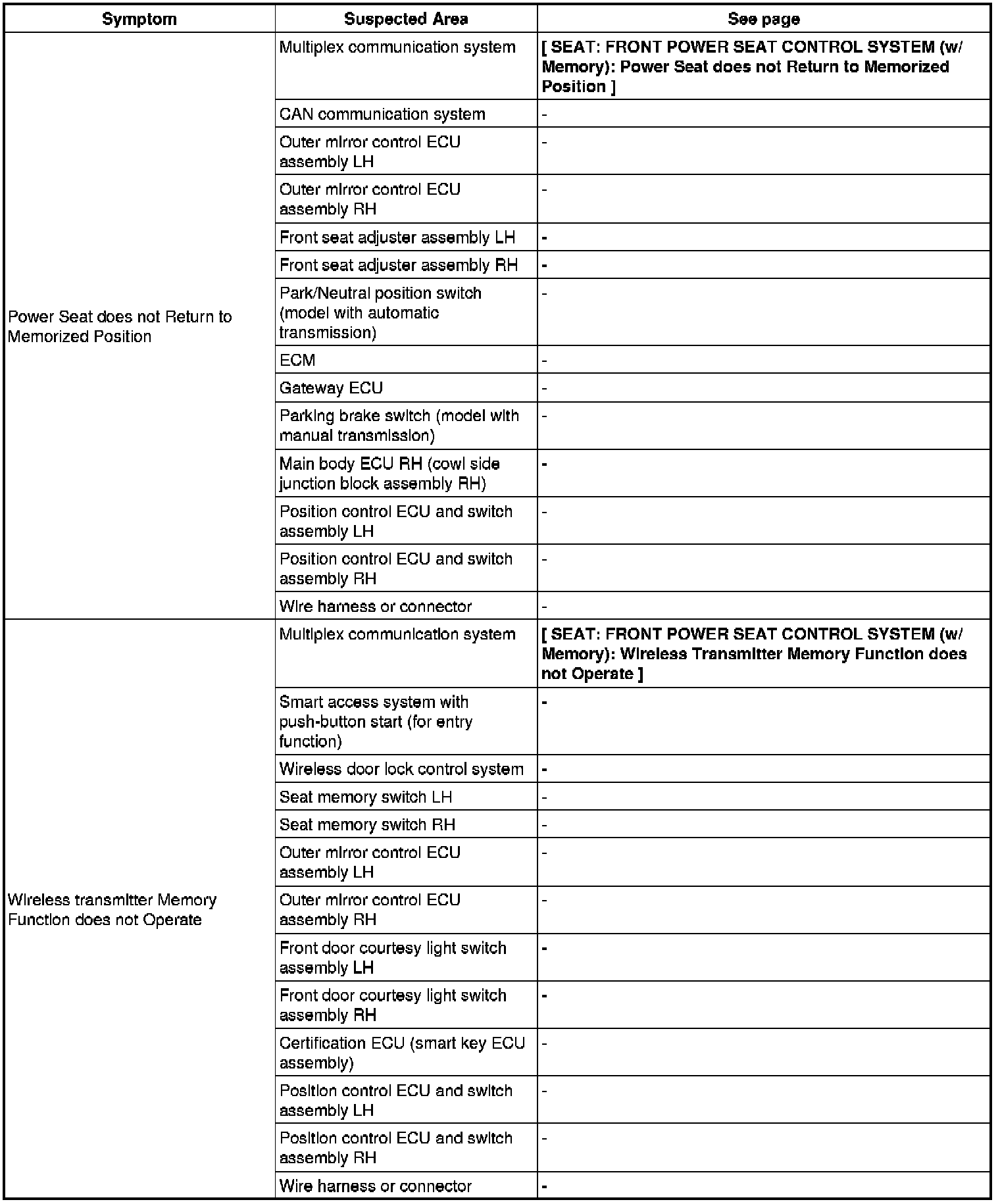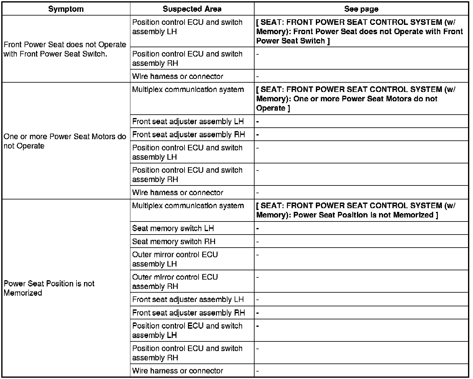 SEAT: FRONT POWER SEAT CONTROL SYSTEM (W/ Memory): PROBLEM SYMPTOMS TABLE