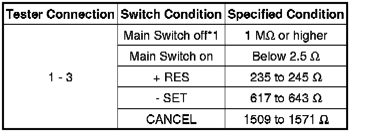 If the result is not as specified, replace the cruise control main switch.