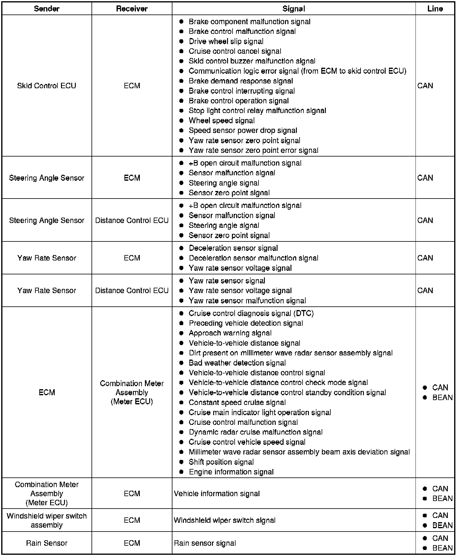 (e) In vehicle-to-vehicle distance control mode, the dynamic radar cruise control system receives signals from the yaw rate and acceleration sensor and the steering angle sensor. Based on these signals, it then estimates curve radius and compensates for information on the preceding vehicle while turning. It can also compensate for the brake control when approaching another vehicle.