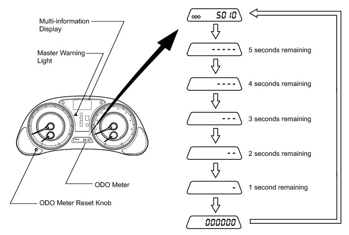 (d) Turn the engine switch on (IG) while pressing and holding the trip meter reset knob. Hold the trip meter reset knob until the following conditions are met and 5 seconds have passed.