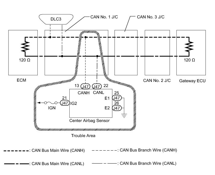 NG -- REPAIR OR REPLACE CENTER AIRBAG SENSOR BRANCH WIRE OR CONNECTOR (CANH, CANL)