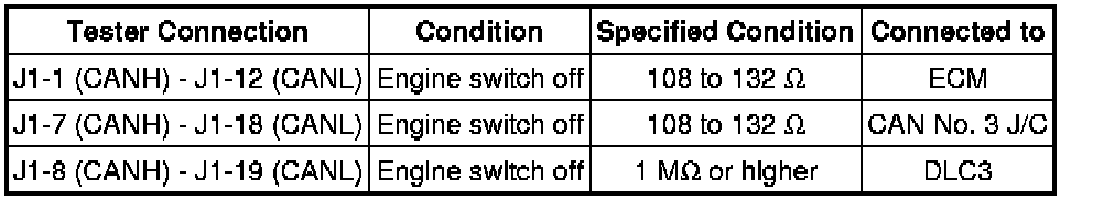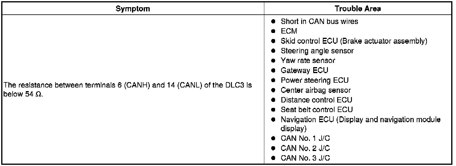 The CAN bus wires are considered to be shorted when the resistance between terminals 6 (CANH) and 14 (CANL) of the DLC3 is below 54 Ohms.