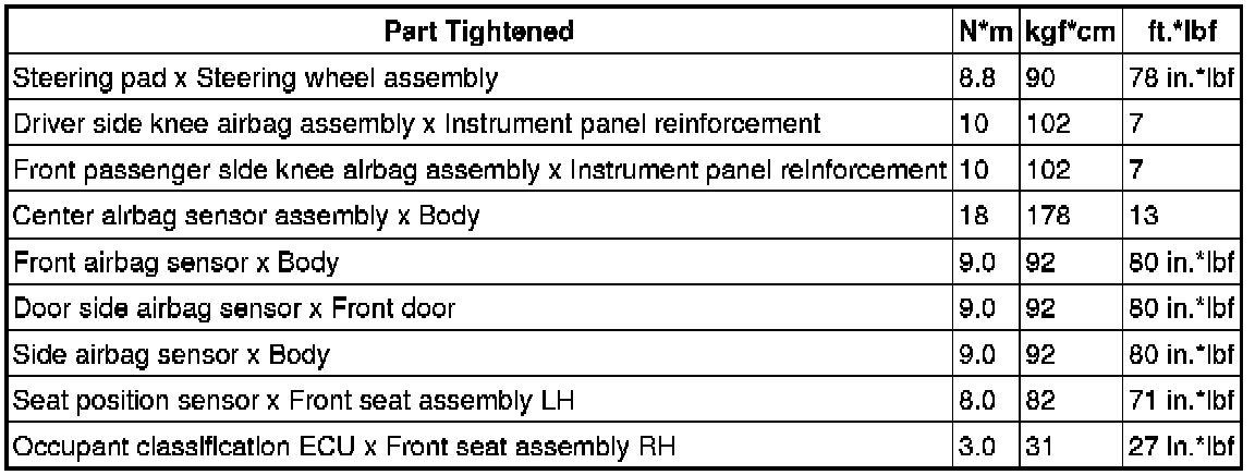 SPECIFICATIONS: SUPPLEMENTAL RESTRAINT SYSTEMS: TORQUE SPECIFICATIONS