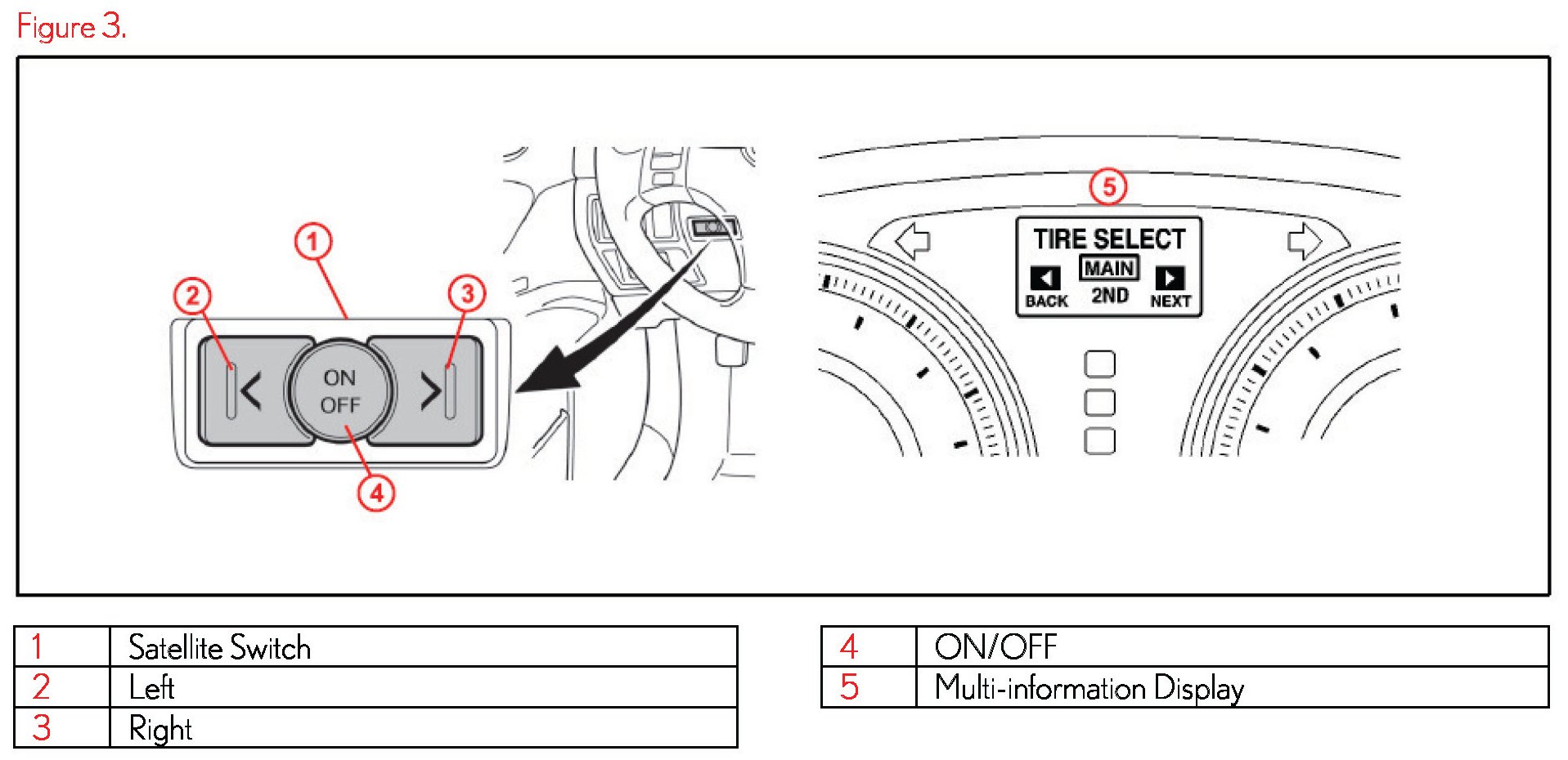 3. Press and hold either the right or left side of the satellite switch until the multi-information display for "TIRE SELECT" appears. Check that "MAIN" is selected.