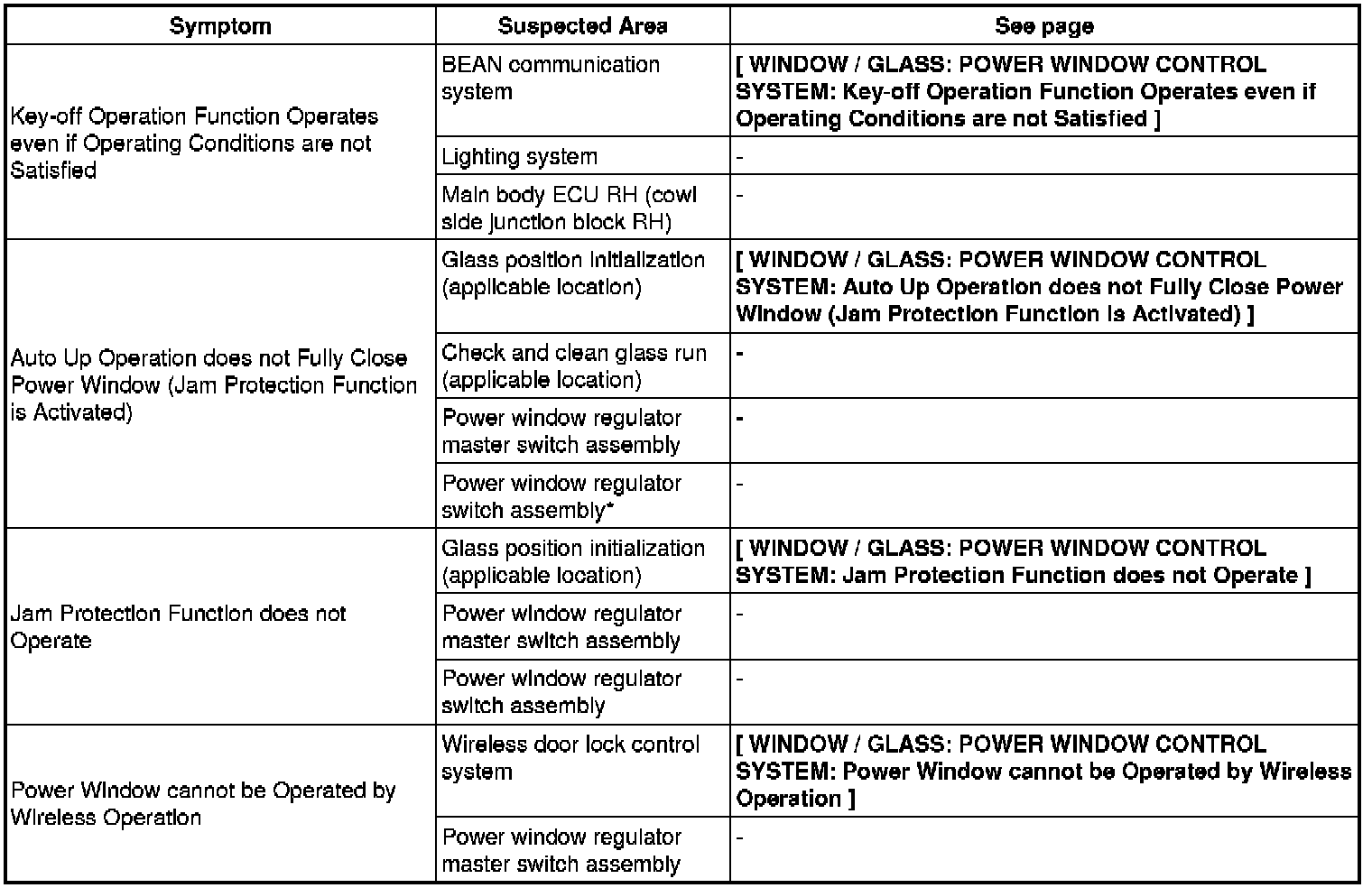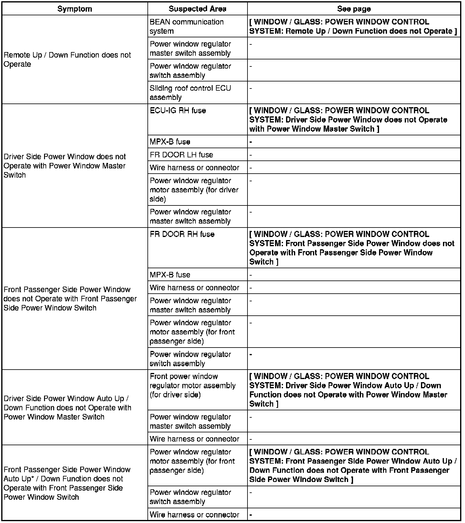 WINDOW / GLASS: POWER WINDOW CONTROL SYSTEM: PROBLEM SYMPTOMS TABLE