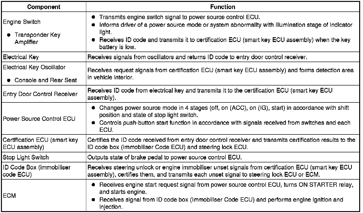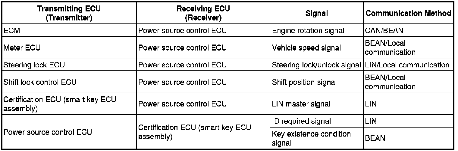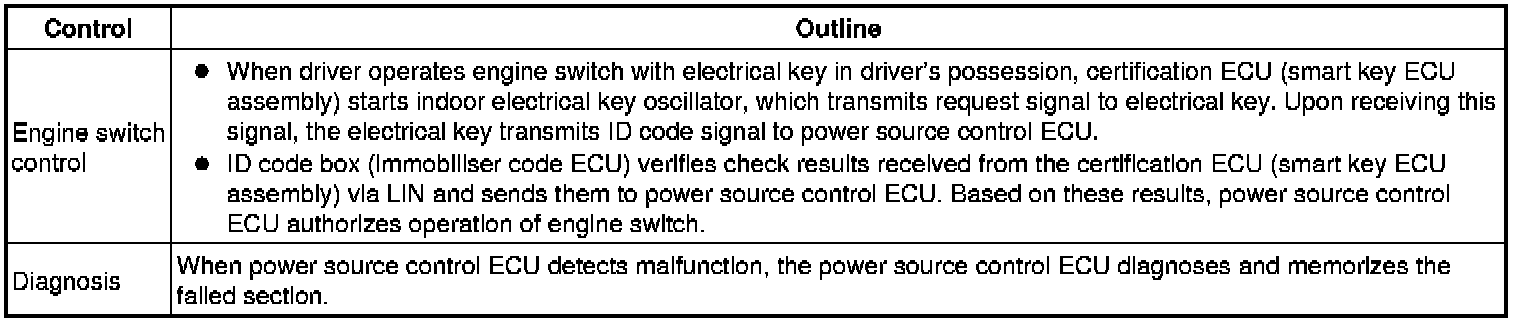 (a) The push-button start uses a push-type engine switch, which the driver can operate by merely carrying the electrical key. This system consists primarily of the power source control ECU, engine switch, ID code box (immobilizer code ECU), steering lock ECU, electrical key, ACC relay, IG1 relay, IG2 relay and certification ECU (smart key ECU assembly). The power source control ECU controls the system. This function operates in cooperation with the smart access system with push-button start.