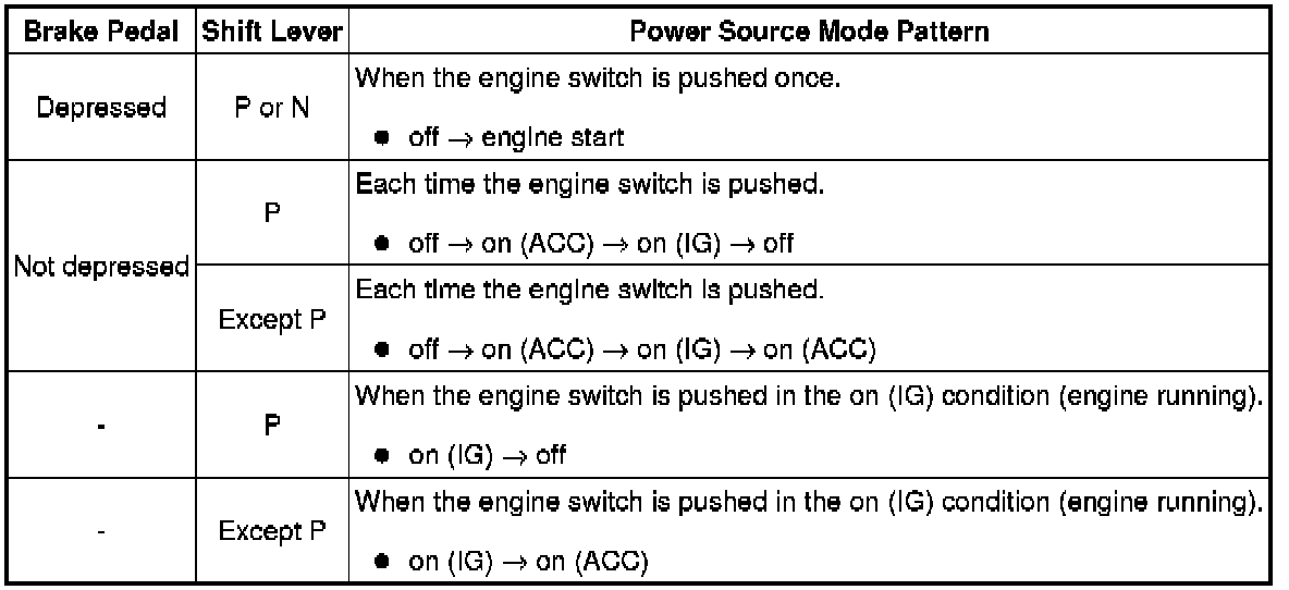 (h) After the buzzer sounds, if the engine switch is pressed within 5 seconds with the brake pedal not depressed, the power source mode changes to on (ACC) or on (IG), the same as in the normal condition.