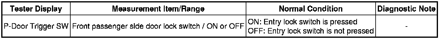 If the front passenger side door entry lock function does not operate but the entry unlock function operates, the communication line between the vehicle and electrical key transmitter is normal. Any of the following components may have a malfunction: 1) touch sensor circuit certification ECU (smart key ECU assembly); 2) front door outside handle assembly (front passenger side); or 3) door electrical key oscillator (front passenger side).