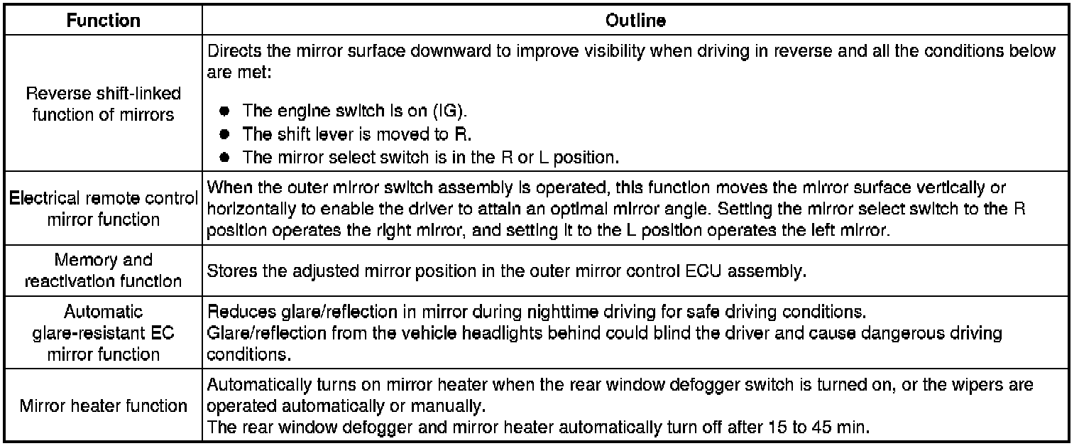 (a) This system has the following functions: automatic glare-resistant electrochromic (EC) mirror function, reverse shift-linked function, electrical remote control function, memory function and mirror heater function.