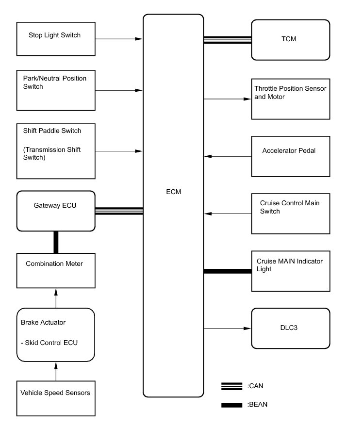 * The ECM compares the driving vehicle speed from the speed sensors with the stored vehicle speed set through the cruise control main switch. The ECM instructs the throttle valve motor of the throttle body assembly to close the valve when the driving speed is greater than the stored speed, and instructs it to open the valve when the driving speed is less than the stored speed.