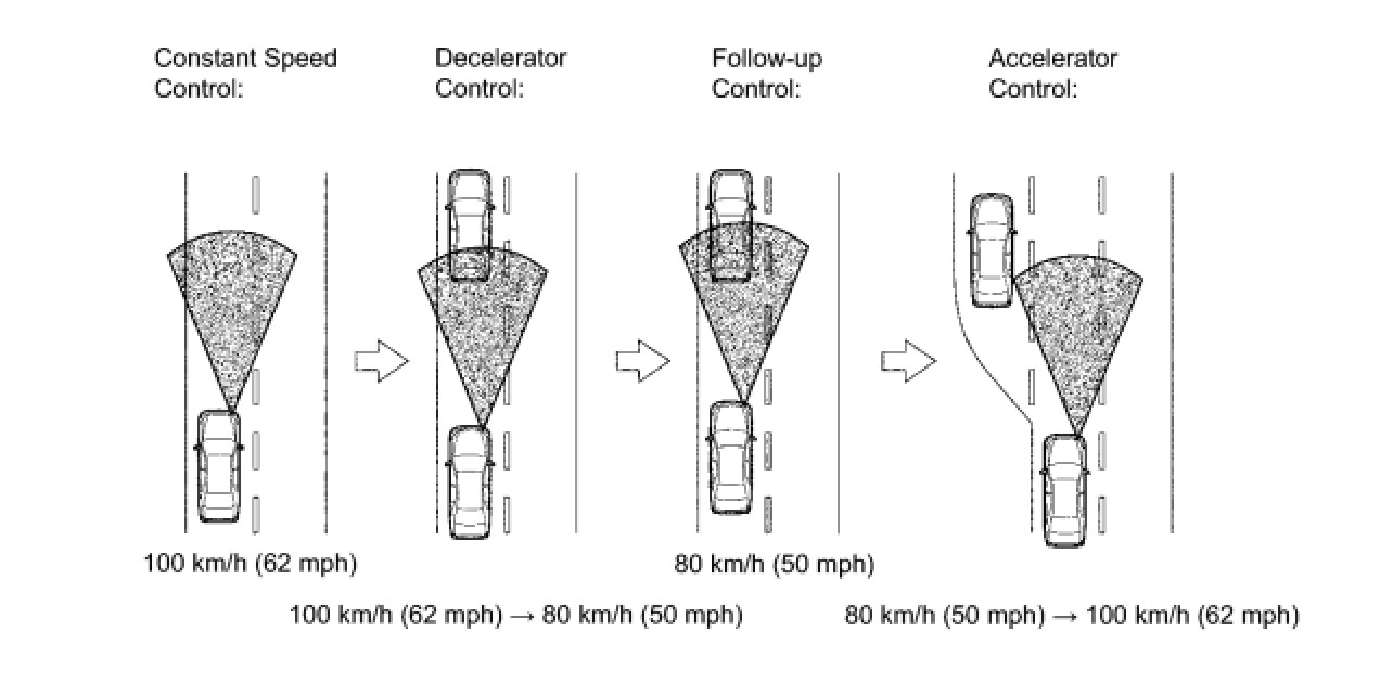 (c) The constant speed control mode is designed to maintain a constant cruising speed. The vehicle-to-vehicle distance control mode is designed to control cruising at a constant speed function, deceleration cruising function, follow-up cruising function, and acceleration cruising function.