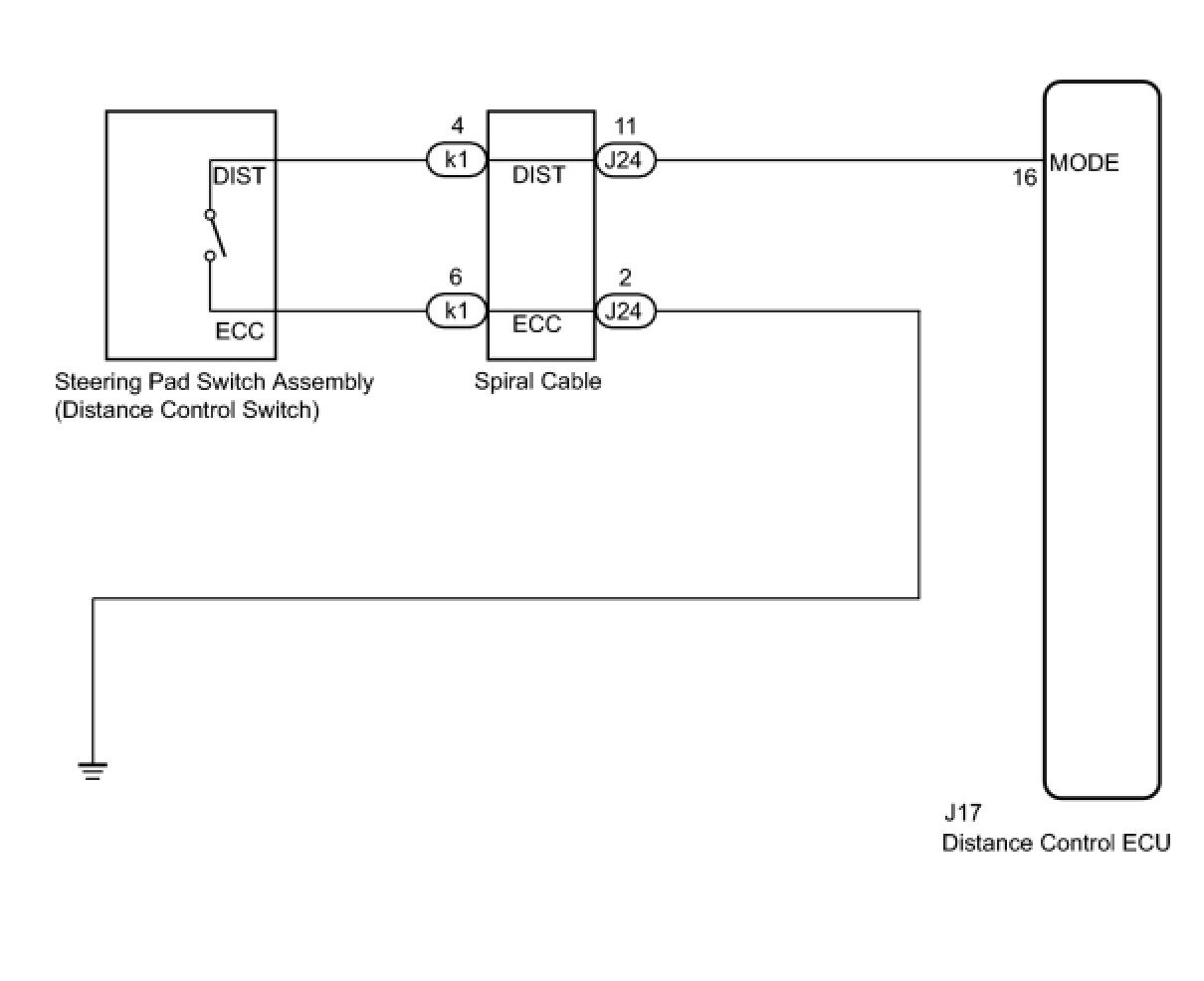 The distance control switch sets the vehicle-to-vehicle distance control mode. The distance control switch is installed in the steering pad switch. The vehicle-to-vehicle distance set value can be changed by operating the steering pad switch (distance control switch) while the dynamic radar cruise control system is in operation. The steering pad switch uses the BEAN to communicate with each ECU. Therefore, it does not have a direct connection with the ECM. If there are any malfunctions in the communication line of the steering pad switch, one or more DTCs in the multiplex communication system are output.