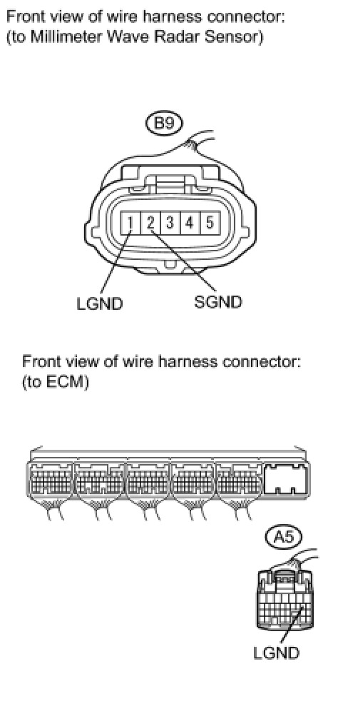This circuit provides power to the millimeter wave radar sensor. The millimeter wave radar sensor emits radio waves towards an object in front and measures the distance and direction of the object by receiving the beam reflections. Based on the reflections, the sensor calculates the difference in speed between the vehicle and the object in front. This data is transmitted to the distance control ECU. The ECU recognizes the millimeter wave radar sensor via terminals LGND. If an open circuit occurs in the wire harness between terminals LGND, the ECM cannot recognize the millimeter wave radar sensor. The ECM will stop the control of the vehicle-to-vehicle distance control mode and only the constant speed control mode can be used.