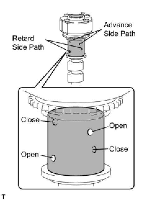 (3) Apply approximately 200 kPa (2.0 kgf/cm2, 28 psi) of air pressure to the 2 broken paths (the advance side path and the retard side path).