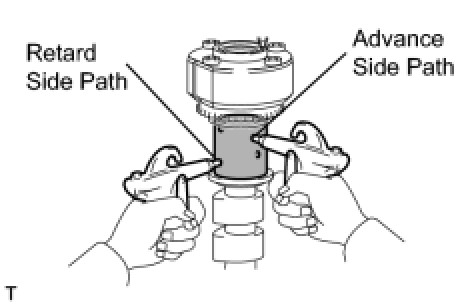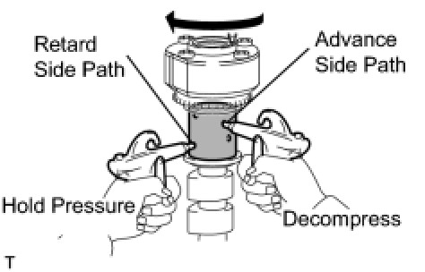 (4) Check that the camshaft timing exhaust gear assembly rotates in the retard direction when reducing the air pressure applied to the advance side path.