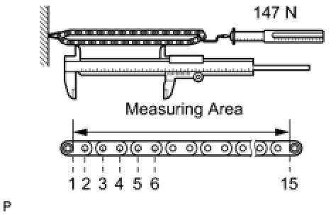 (a) Using a spring scale, pull the No. 2 chain sub-assembly with a force of 147 N (15 kgf, 33 lbf) as shown in the illustration.