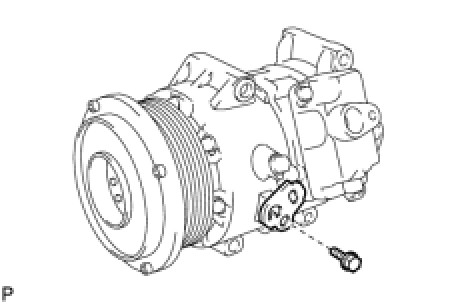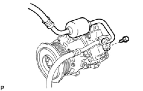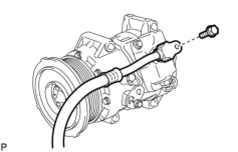 (d) Install the discharge hose sub-assembly onto the compressor and pulley with the bolt.
