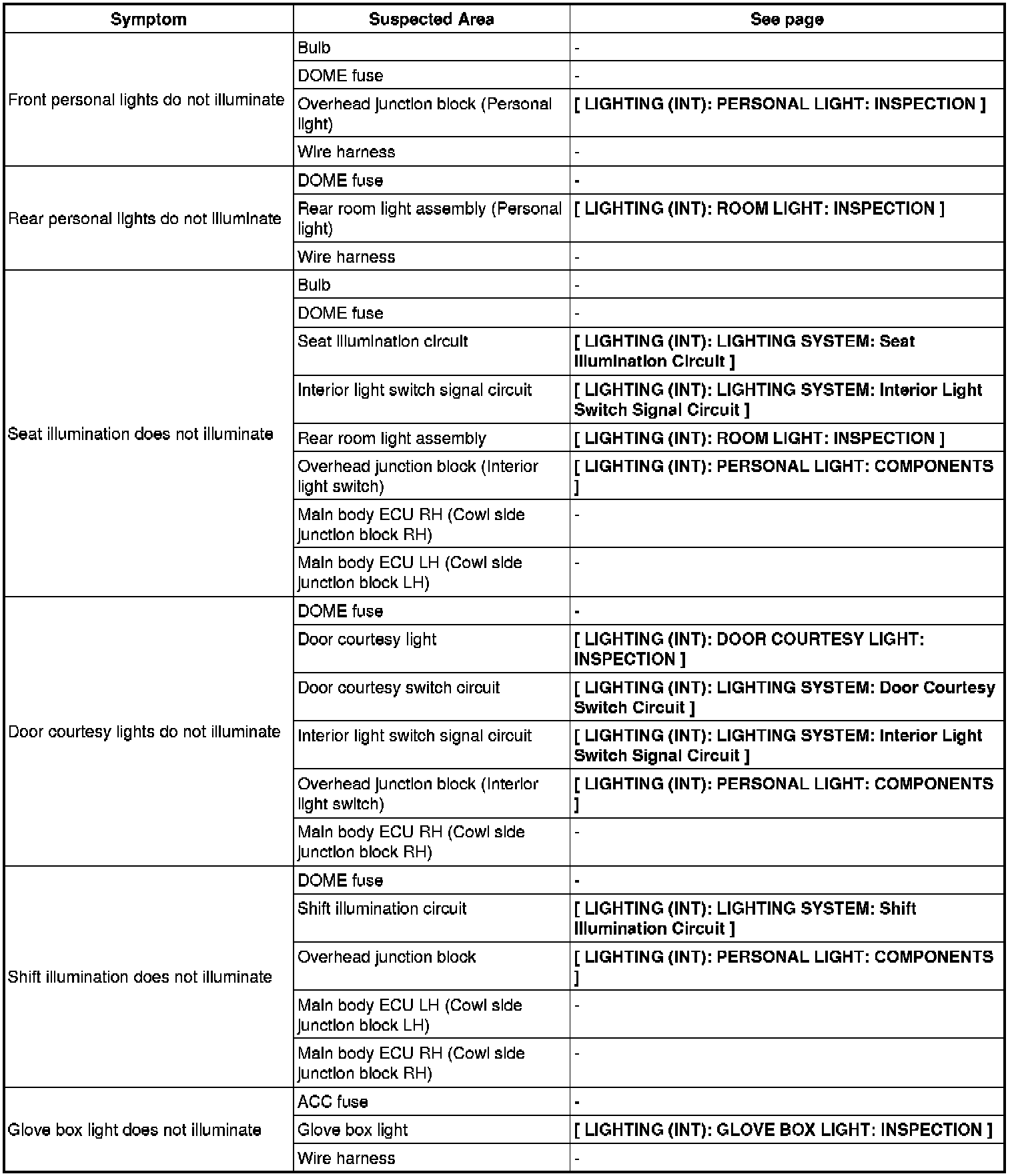 LIGHTING (INT): LIGHTING SYSTEM: PROBLEM SYMPTOMS TABLE