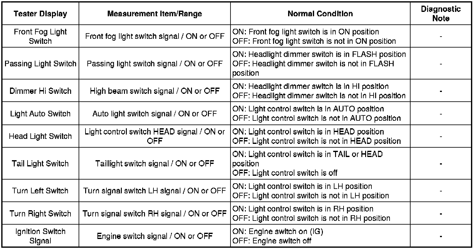 Using the Techstream to read the Data List allows the values or states of switches, sensors, actuators and other items to be read without removing any parts. This non-intrusive inspection can be very useful because intermittent conditions or signals may be discovered before parts or wiring is disturbed. Reading the Data List information early in troubleshooting is one way to save diagnostic time.
