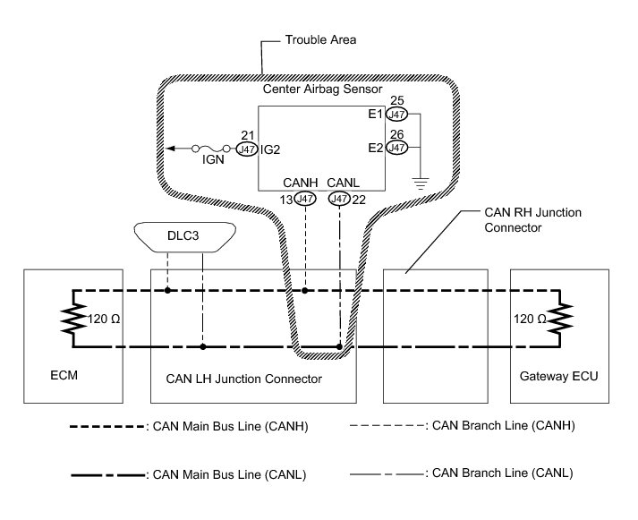 NG -- REPAIR OR REPLACE CENTER AIRBAG SENSOR BRANCH WIRE OR CONNECTOR (CANH, CANL)