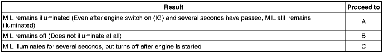 When the engine switch is first turned on (IG), the MIL should be illuminated and should then turn off. If the MIL remains illuminated or is not illuminated, conduct the following troubleshooting procedure.