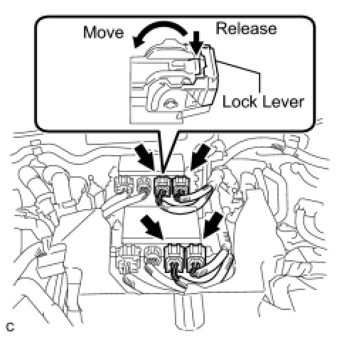 (3) Disconnect the 4 connectors with wire harness locks from the 2 injector drivers.