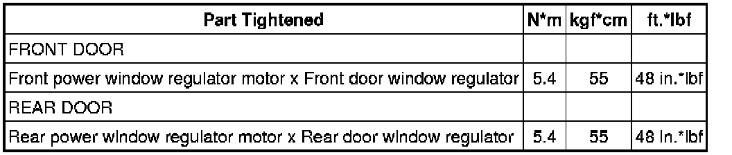 SPECIFICATIONS: WINDOW / GLASS: TORQUE SPECIFICATIONS