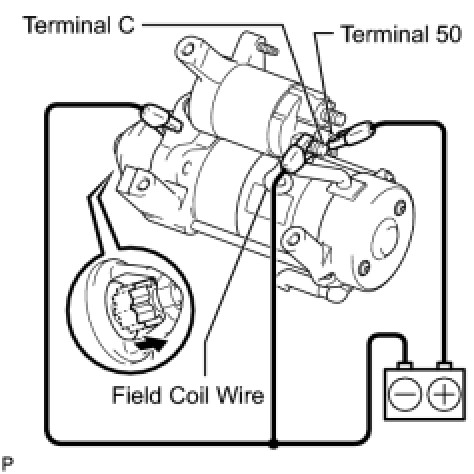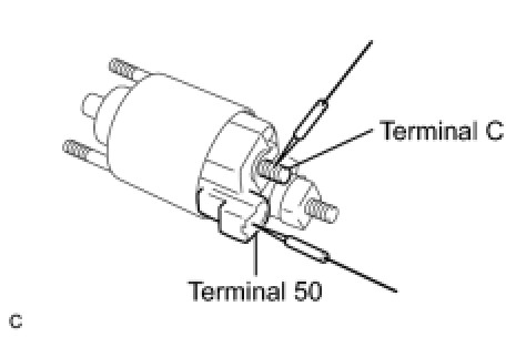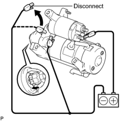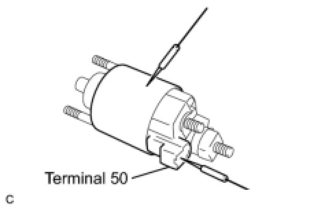 (1) Disconnect the negative (-) terminal lead from terminal C while maintaining the condition specified for the pull-in test above. Check that the pinion gear remains out.