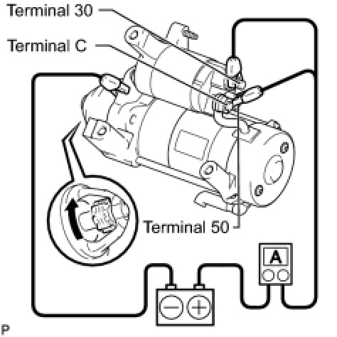 (3) Connect the battery and an ammeter to the starter as shown in the illustration.