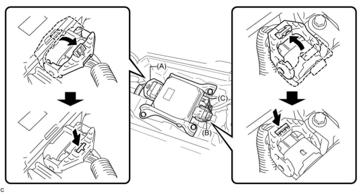 (b) Connect the connectors (A), (B) and (C) to the power steering ECU assembly.
