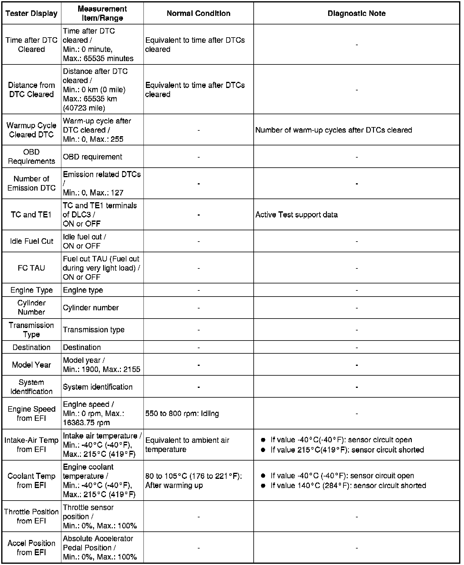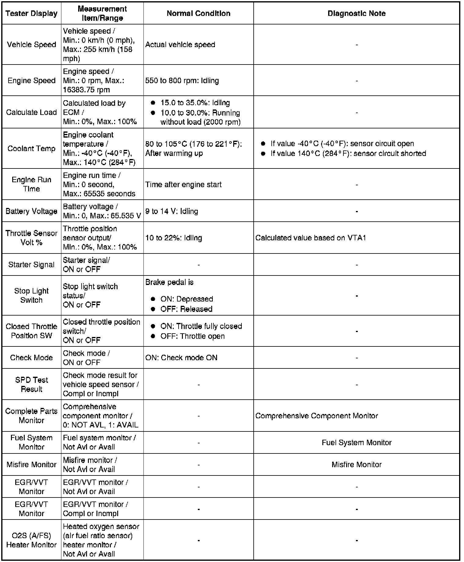 Using the Techstream to read the Data List allows the values or states of switches, sensors, actuators and other items to be read without removing any parts. This non-intrusive inspection can be very useful because intermittent conditions or signals may be discovered before parts or wiring is disturbed. Reading the Data List information early in troubleshooting is one way to save diagnostic time.