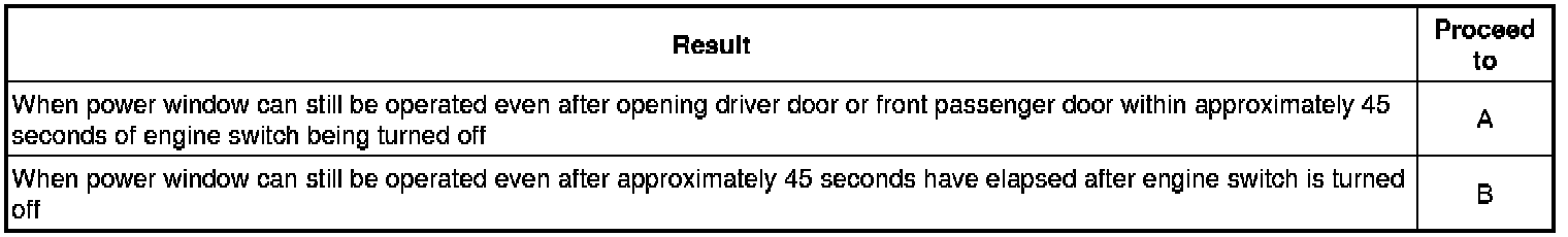 * However, when approximately 45 seconds have elapsed, or the driver side door or front passenger door is opened within approximately 45 seconds of the engine switch being turned off, the power window regulator motor assembly disables manual operation.