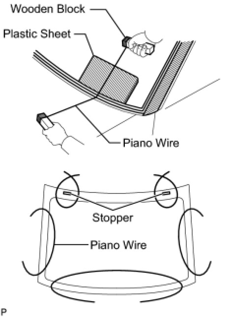 * To prevent the package tray from being scratched when removing the back window glass, place a plastic sheet between the piano wire and package tray.