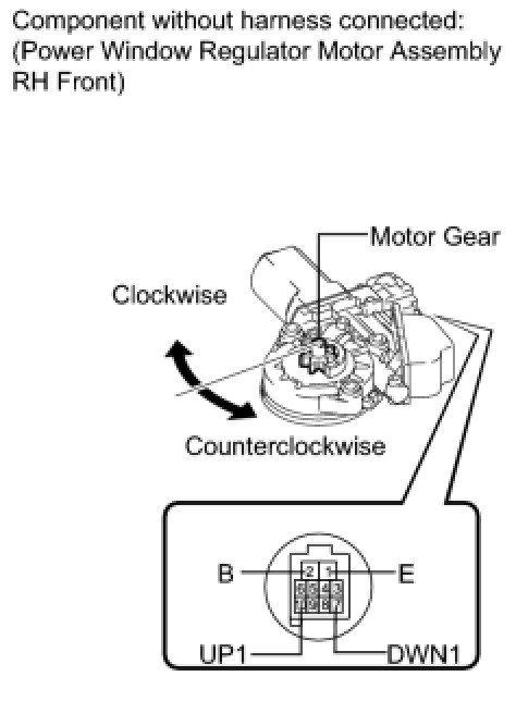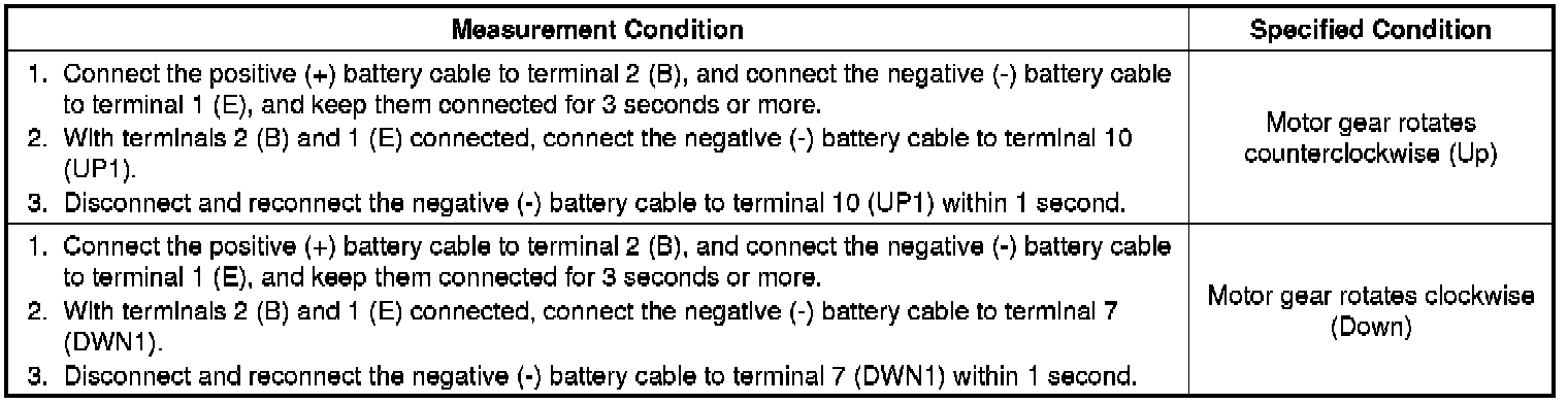 (b) Apply negative (-) battery voltage to connector terminals 1 (E) and 7 (DWN1) or 10 (UP1).