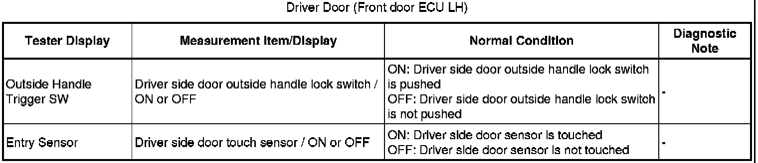 When the driver door entry lock and unlock functions do not operate, one of the following may be malfunctioning: 1) power door lock system, 2) driver side door electrical key oscillator, or 3) certification ECU.