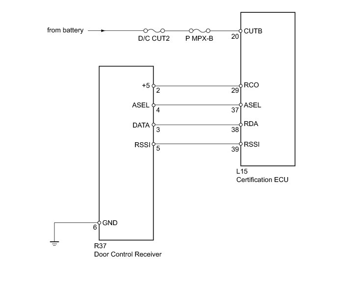 When the entry operation and wireless operation door lock function does not operate, a malfunction or wave interference may be occurring in either of the following: 1) signal communication line between the door control receiver and certification ECU (line is used by entry and wireless); or 2) electrical key transmitter.