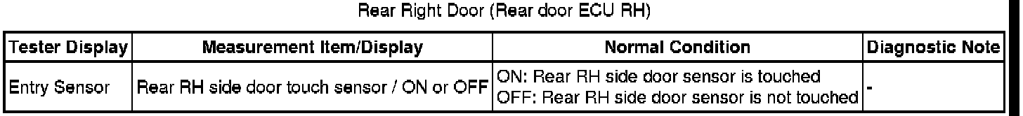 If the rear right door entry unlock function does not operate but the entry lock operation operates, the communication line between the vehicle and electrical key transmitter is normal. Either of the following may have occurred: 1) the door outside handle touch sensor is malfunctioning; or 2) the rear door ECU RH receives the door outside handle touch sensor ON signal, but is unable to send the signal to the certification ECU through CAN communication.