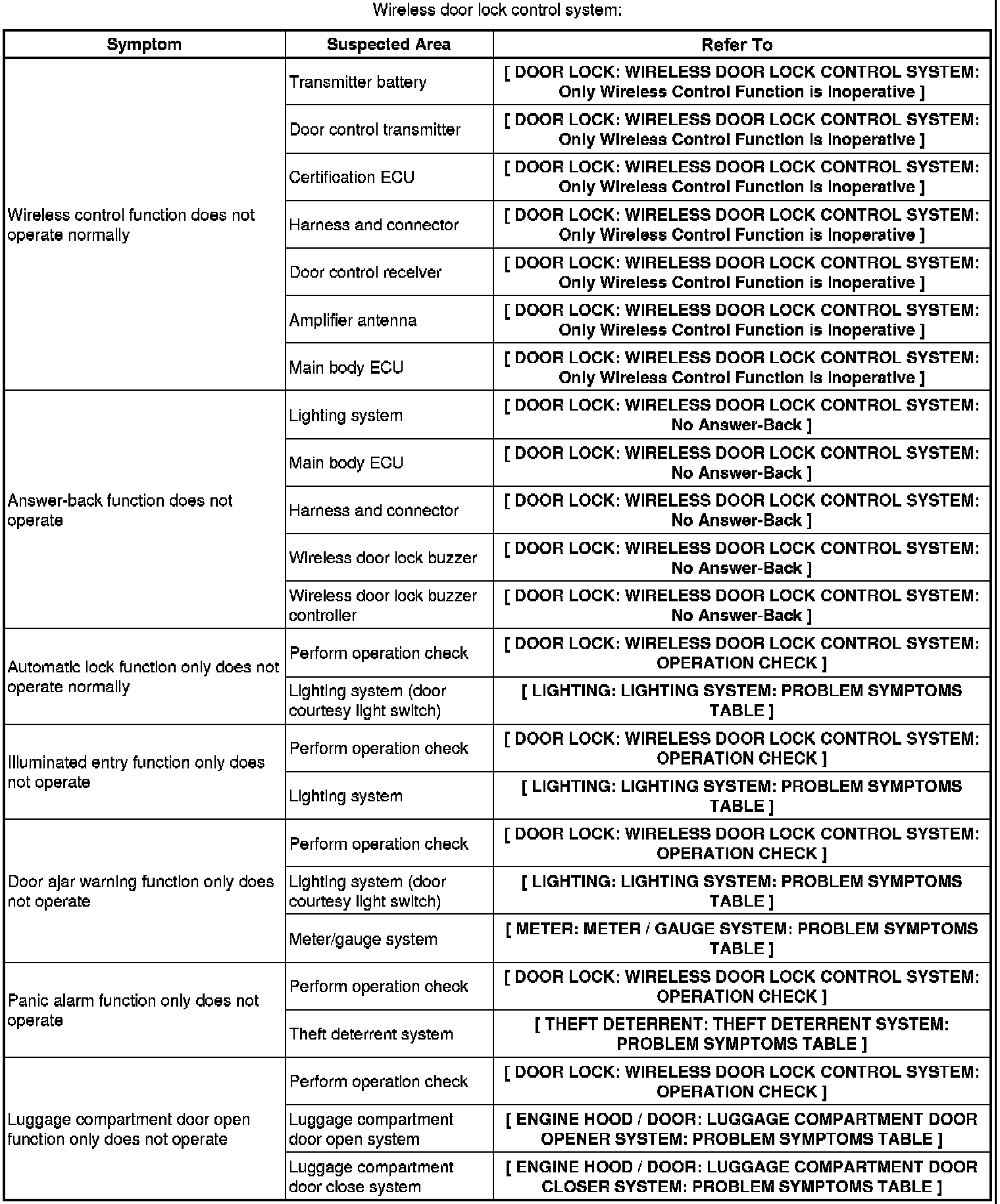 DOOR LOCK: WIRELESS DOOR LOCK CONTROL SYSTEM: PROBLEM SYMPTOMS TABLE