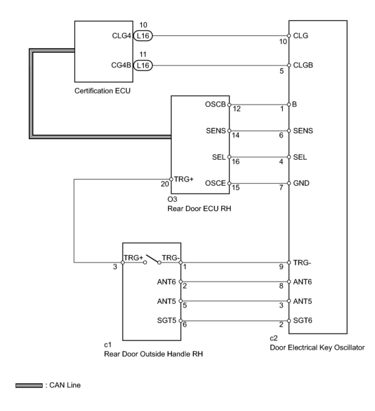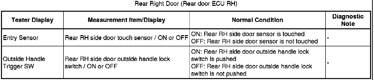 When the rear door RH entry lock and unlock functions do not operate, one of the following may be malfunctioning: 1) power door lock system, 2) rear door RH electrical key oscillator, or 3) certification ECU.