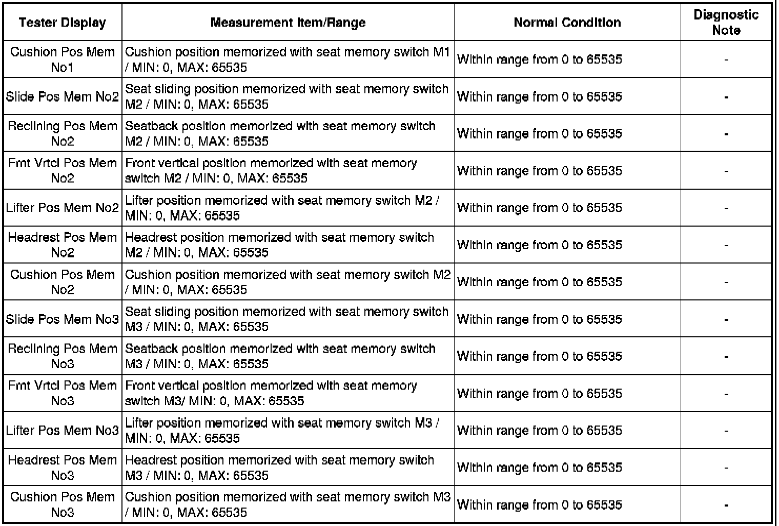In the table below, the values listed under "Normal Condition" are reference values. Do not depend solely on these reference values when deciding whether a part is faulty or not.