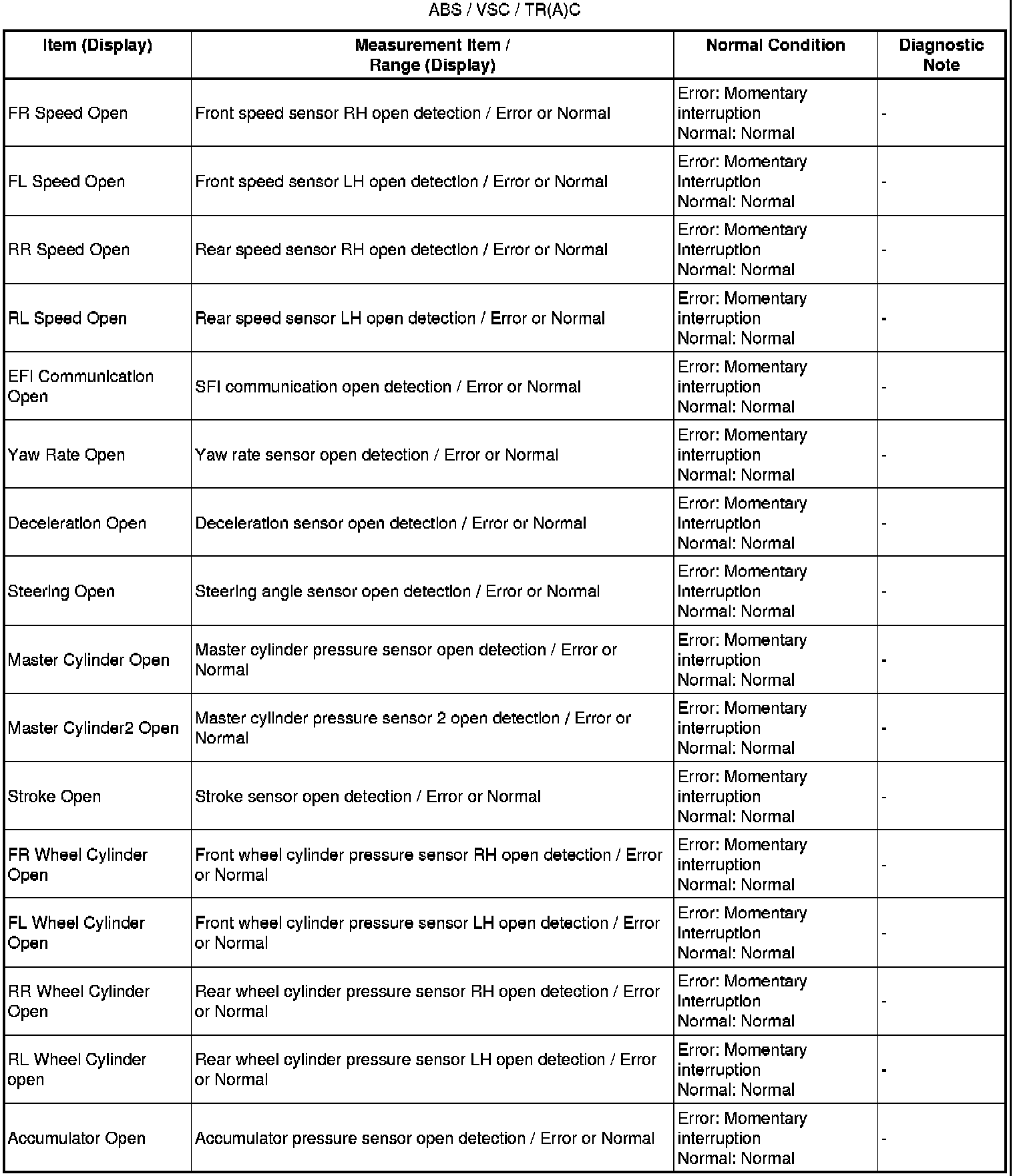 A momentary interruption (open circuit) in the connectors and/or wire harness between the sensors and ECUs can be detected in the ECU Data List function of the Techstream.